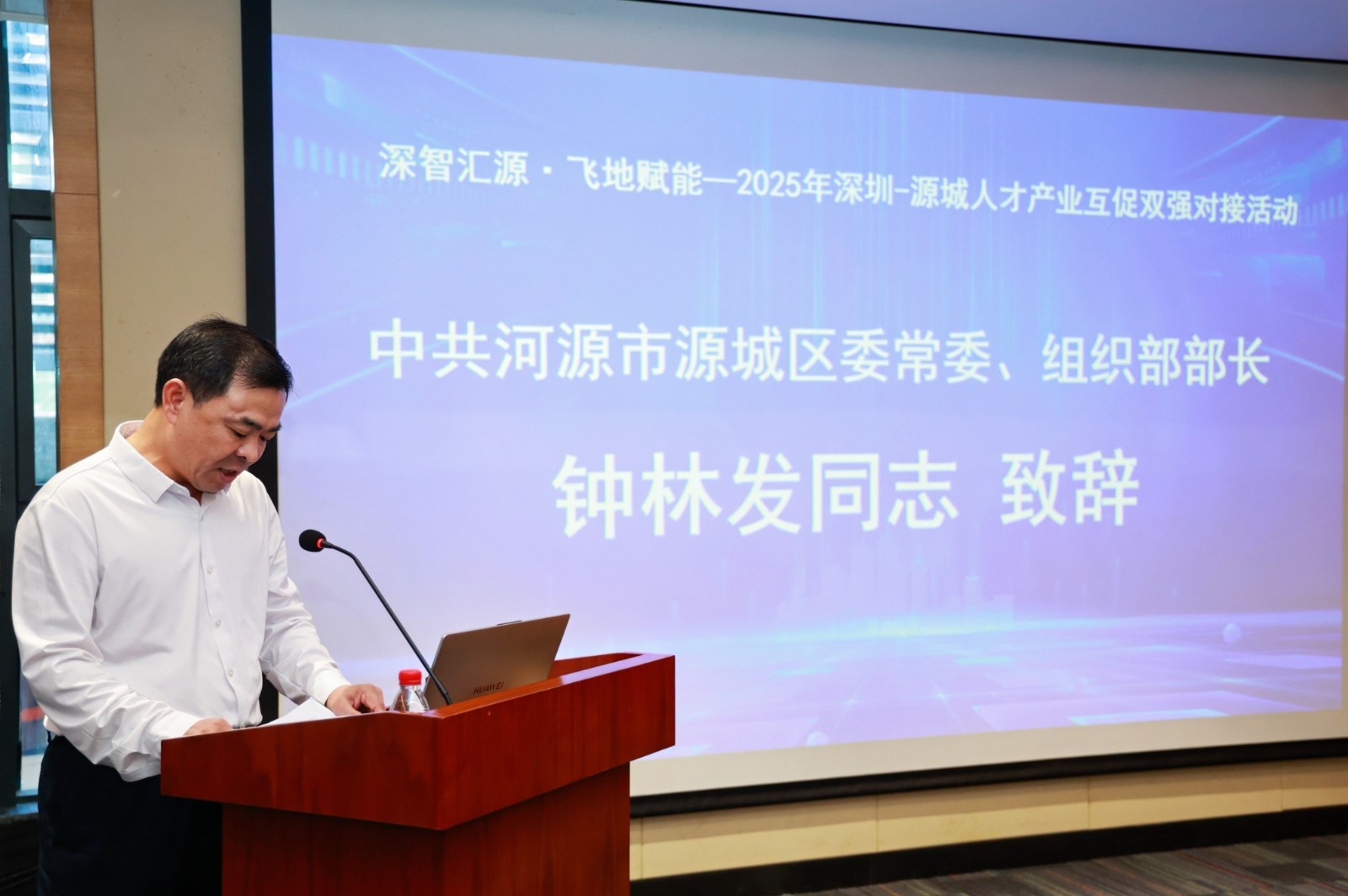 中共河源市源城区委常委、组织部部长钟林发随后致辞,深入阐述了源城区在电子信息、智能制造等重点产业方面的发展需求与合作愿景,强调了建设“人才双向飞地”对落实“百千万工程”、城乡区域协调发展、推动县域经济高质量发展的重要意义。
