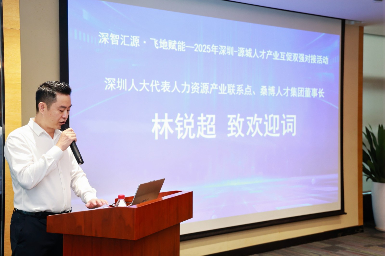 活动在庄重而热烈的氛围中拉开帷幕。深圳桑博人才集团有限公司董事长林锐超首先致欢迎辞,表达了推动“人才双向飞地”建设的坚定信心与系统规划。