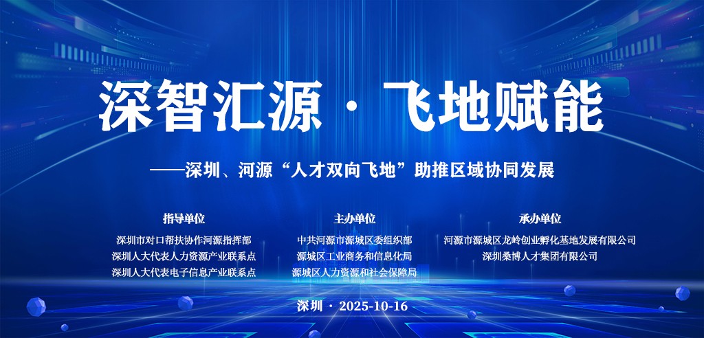 为推动深圳与河源在人才、产业方面的深度融合与协同发展,贯彻落实省委省政府“百千万工程”及“百万英才汇南粤”部署要求,2025年10月16日,由深圳人大代表人力资源产业联系点、中共河源市源城区委组织部等单位共同举办的“深智汇源·飞地赋能——2025年深圳、河源人才产业互促双强对接活动”在华南地区首个国家级人力源产业园——天安云谷成功举行。活动汇聚了深河两地政府部门、重点企业、高校科研机构及高层次人才代表。深圳市人大常委会代表工委主任杨云彪,龙岗区人大常委会代表工委主任陈霜,龙岗区坂田街道党工委副书记、人大工委主任刘习飞,龙岗区人力资源局副局长刘金洲,深圳市人大代表、深圳人大代表电子信息产业联系点召集人江微,深圳人大代表人力资源产业联系点副召集人林锐超以及河源市源城区委常委、组织部部长钟林发,深圳对口帮扶河源指挥部副总指挥长林劲民等领导出席。